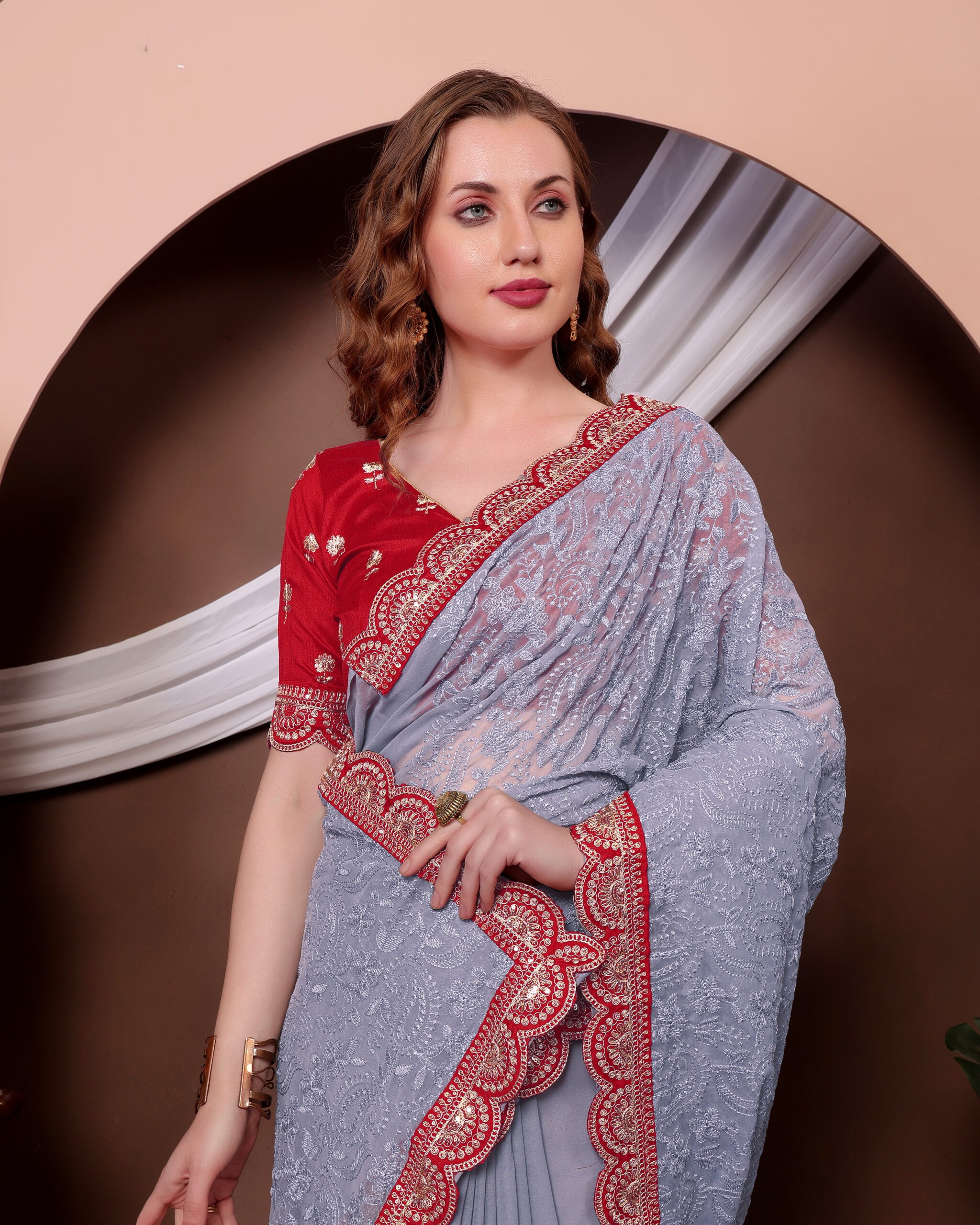 Add a touch of elegance and tradition to your wardrobe with this Heavy Georgette Chikankari Saree. Perfect for weddings, festive occasions, and grand celebrations, this saree combines traditional hand embroidery with modern embellishments to create a timeless ensemble.