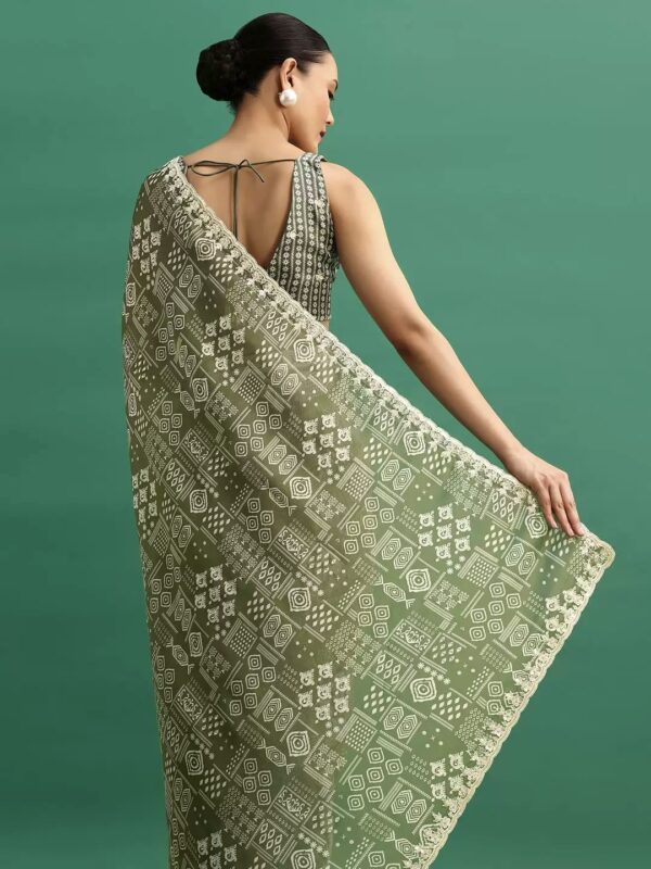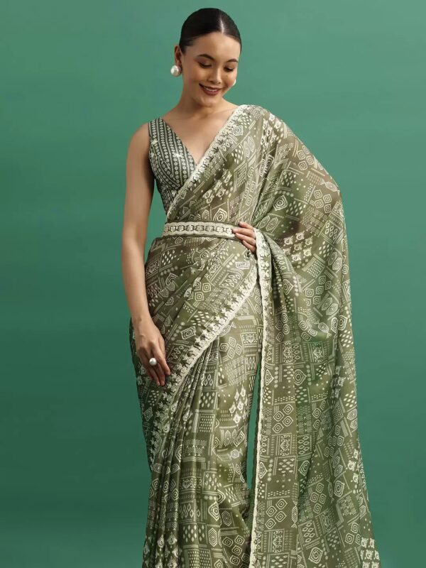 Drape yourself in the beauty of tradition with a touch of modern artistry through this Premium Chinon Silk Saree. Crafted with elegance and sophistication, it blends digital prints with embroidery, codding, and sequins work, making it a perfect outfit for weddings, festive occasions, and grand celebrations.